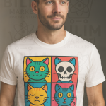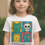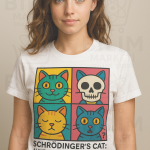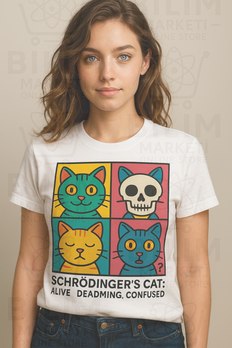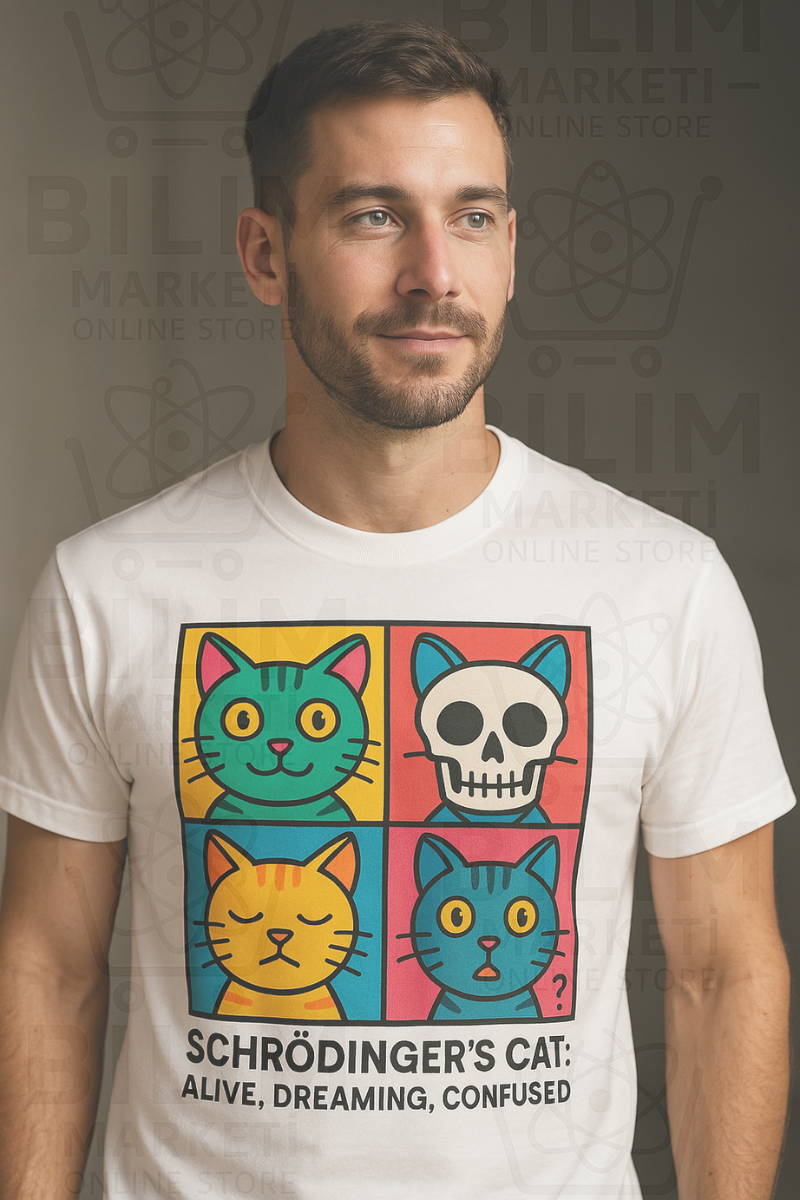 Nerdy, Schrödinger’in Kedisi Pop Art Tasarım T-shirt — Kuantum mekaniğinin en ünlü ikilemini; canlı mı, ölü mü yoksa ikisinin arasında mı, modern bir pop art estetiğiyle stilinize taşıyın. Bilim ve sanat tutkunları için benzersiz bir ifade biçimi!